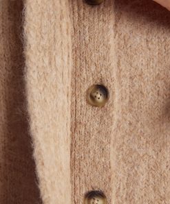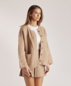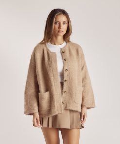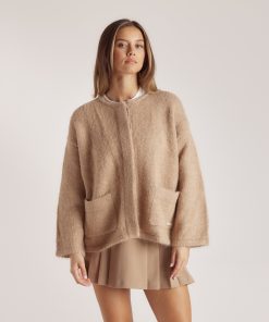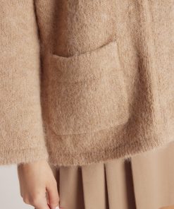 Alpaca yarn jacket Boxy, oversized fit Round-neck design Front pockets Gold engraved logo tab to pocket