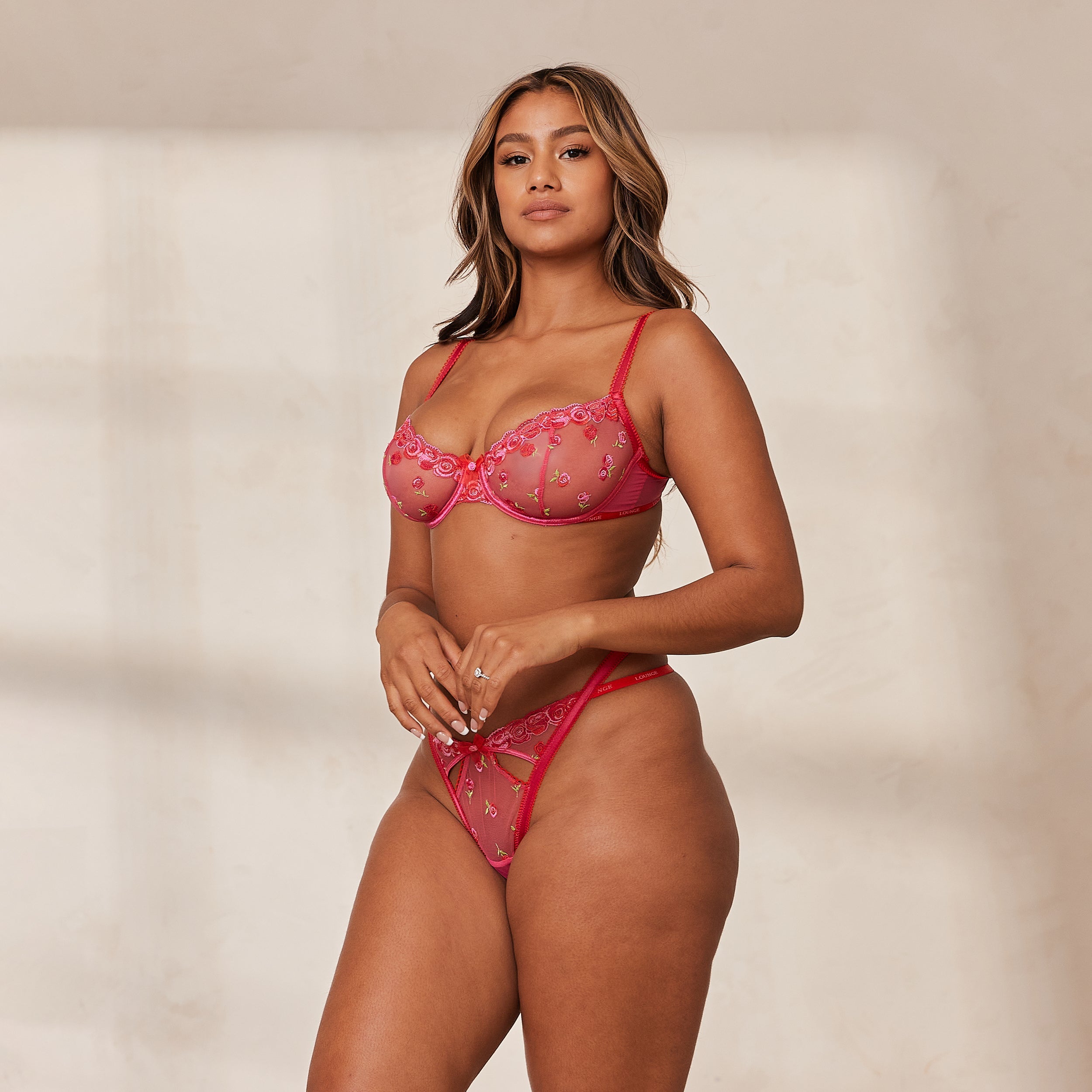 Underwired bra, no padding Two-tone rose inspired embroidery Rosebud and pretty bow details Cut out details Decorative double strapping with Lounge branding Hook and eye fastening Matching bra and g-string/briefs set Silver Lounge engraved hardware 74% Recycled Polyester, 24% Polyester, 2% Elastane Fall head over heels in Lounge love with our Blush Embroidered Set. Super sweet and playful with two-tone rose inspired embroidery, find your perfect match in this gorgeous style.