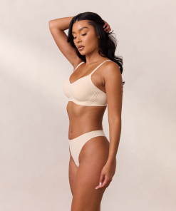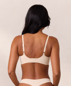 Non-wired bralette with removable foam cups Soft, smoothing stretch fabrication Bonding channels to cradle and underbust for support Raw-cut edging with bonded finish Pocket to inside cup to allow removal of padding Bonded straps Flat bonded hook and eye for a smoothing finish Silver hardware engraved with Lounge logo