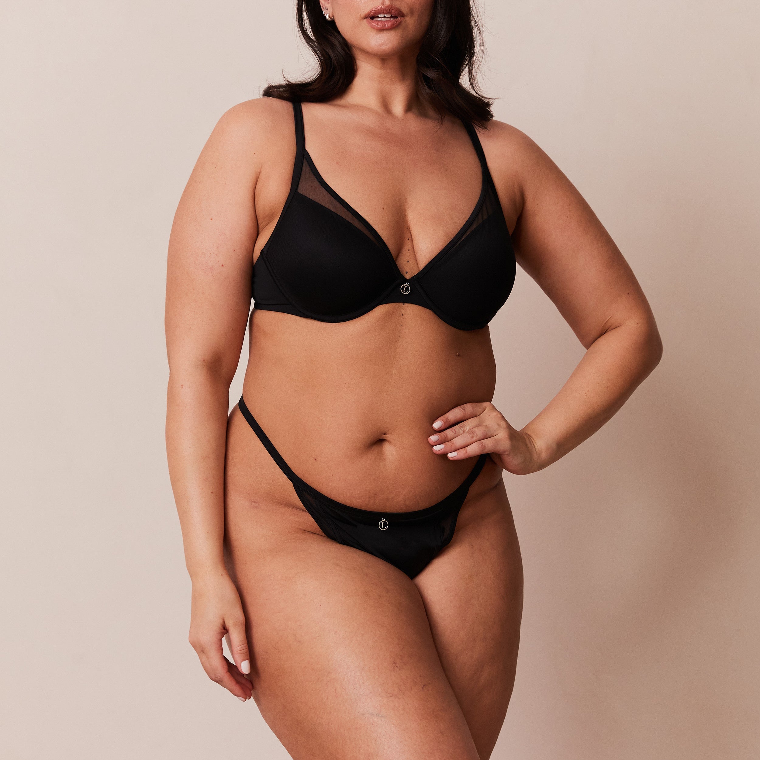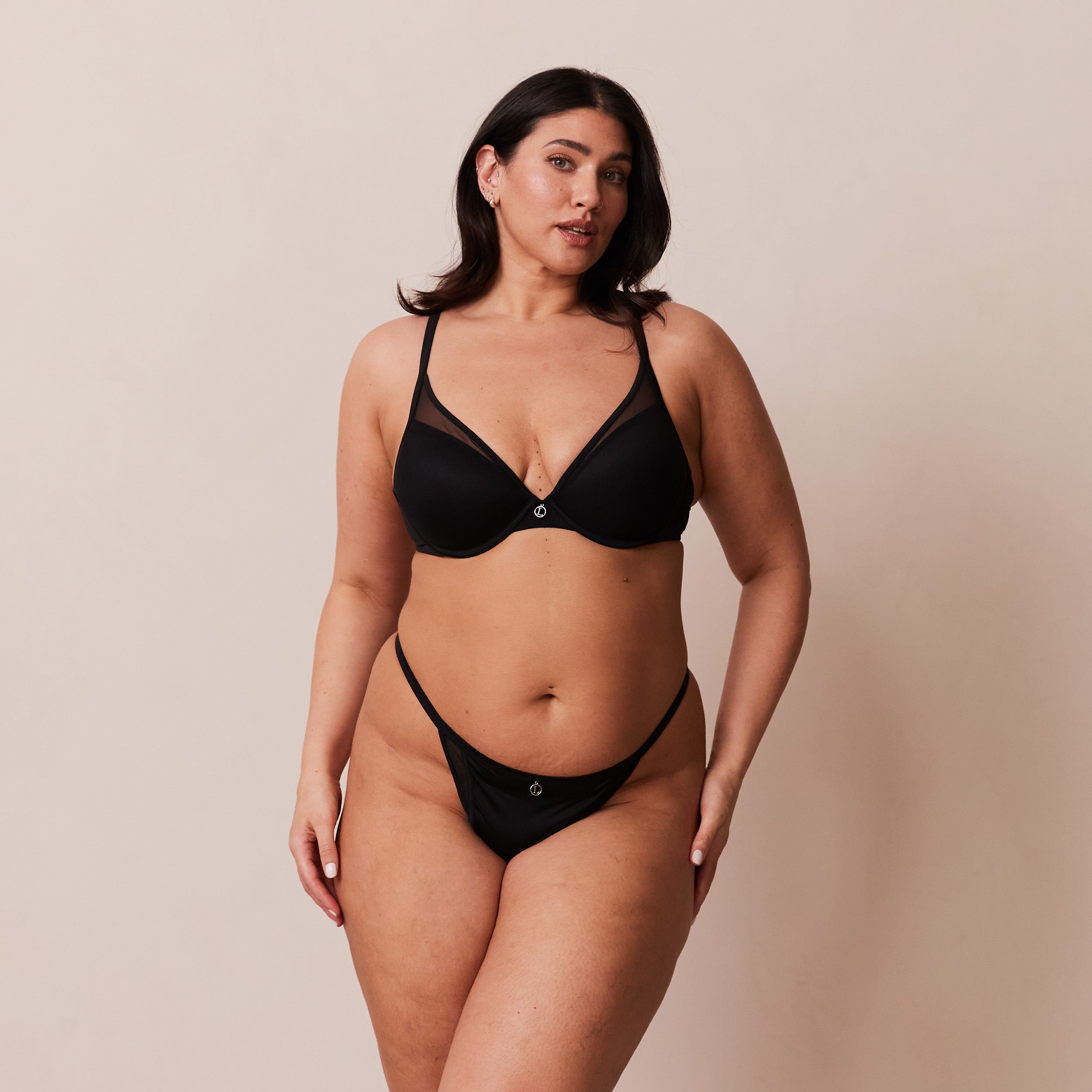 Underwired bra with foam cups and mesh overlay Mesh fabric details paired with smoothing shiny micro fibre Statement L charm Padded hook and eye fastening Silver Lounge hardware 76% Recycled Polyamide, 24% Elastane Our Classic Plunge T-Shirt Bra Set is designed to bring comfort into your everyday. Featuring foam cups with a delicate mesh overlay and high apex, this is the perfect classic set that every underwear drawer needs.