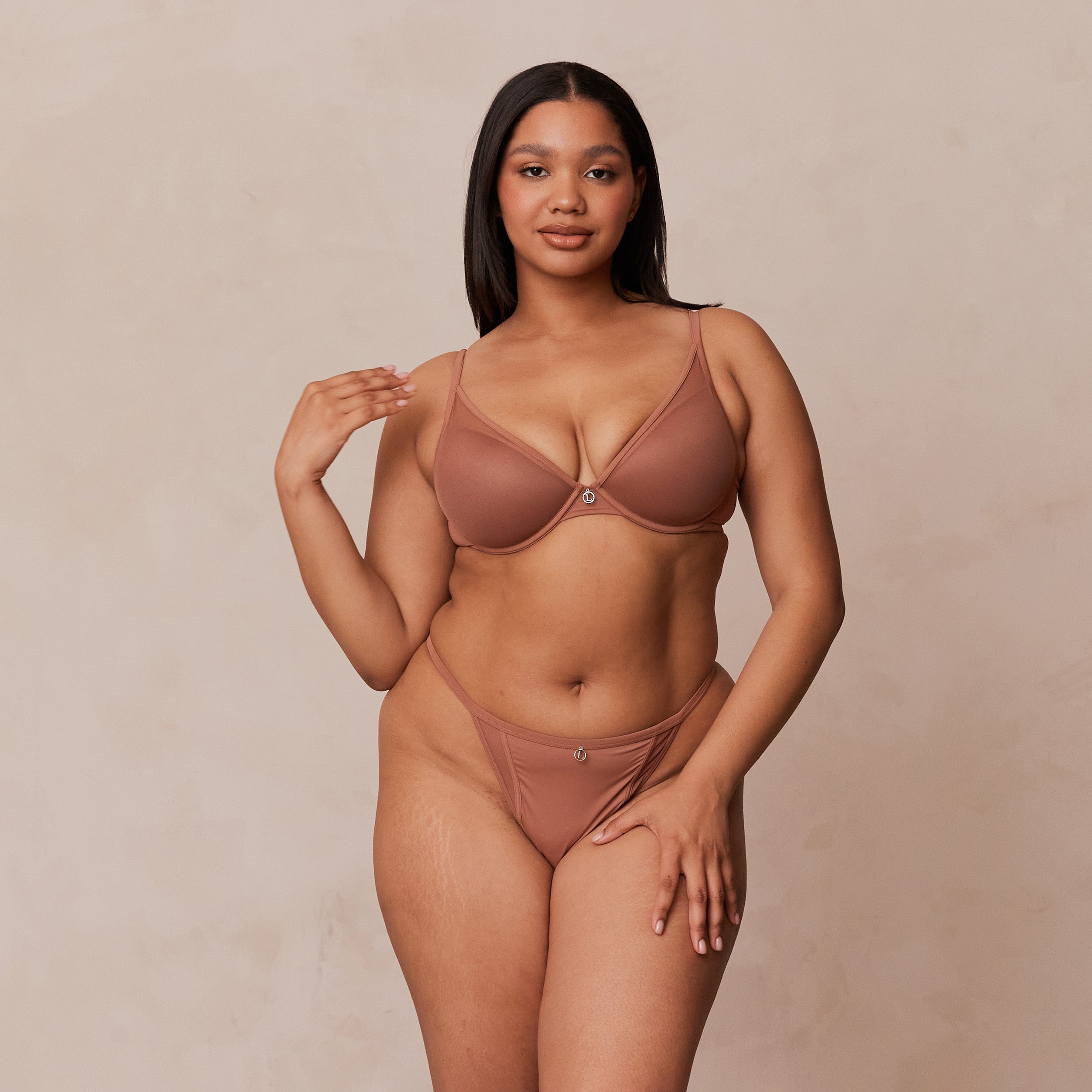 Underwired bra with foam cups and mesh overlay Mesh fabric details paired with smoothing shiny micro fibre Statement L charm Padded hook and eye fastening Silver Lounge hardware 76% Recycled Polyamide, 24% Elastane Our Classic Plunge T-Shirt Bra Set is designed to bring comfort into your everyday. Featuring foam cups with a delicate mesh overlay and high apex, this is the perfect classic set that every underwear drawer needs.