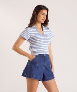 Crochet polo top Contrast stripe design Picot trim to collar and neckline Woven logo badge |Get inspired by this curated style guide to create the perfect look|The Dust and Daisies Collection celebrates unapologetic individuality and the art of self-expression. This collection of western-inspired clothing seamlessly blends oversized and fitted shapes, creating effortlessly flattering outfits.This beautifully soft crochet polo top is the perfect summer staple. Soft, lightweight, and wearable, it belongs in every wardrobe.