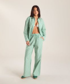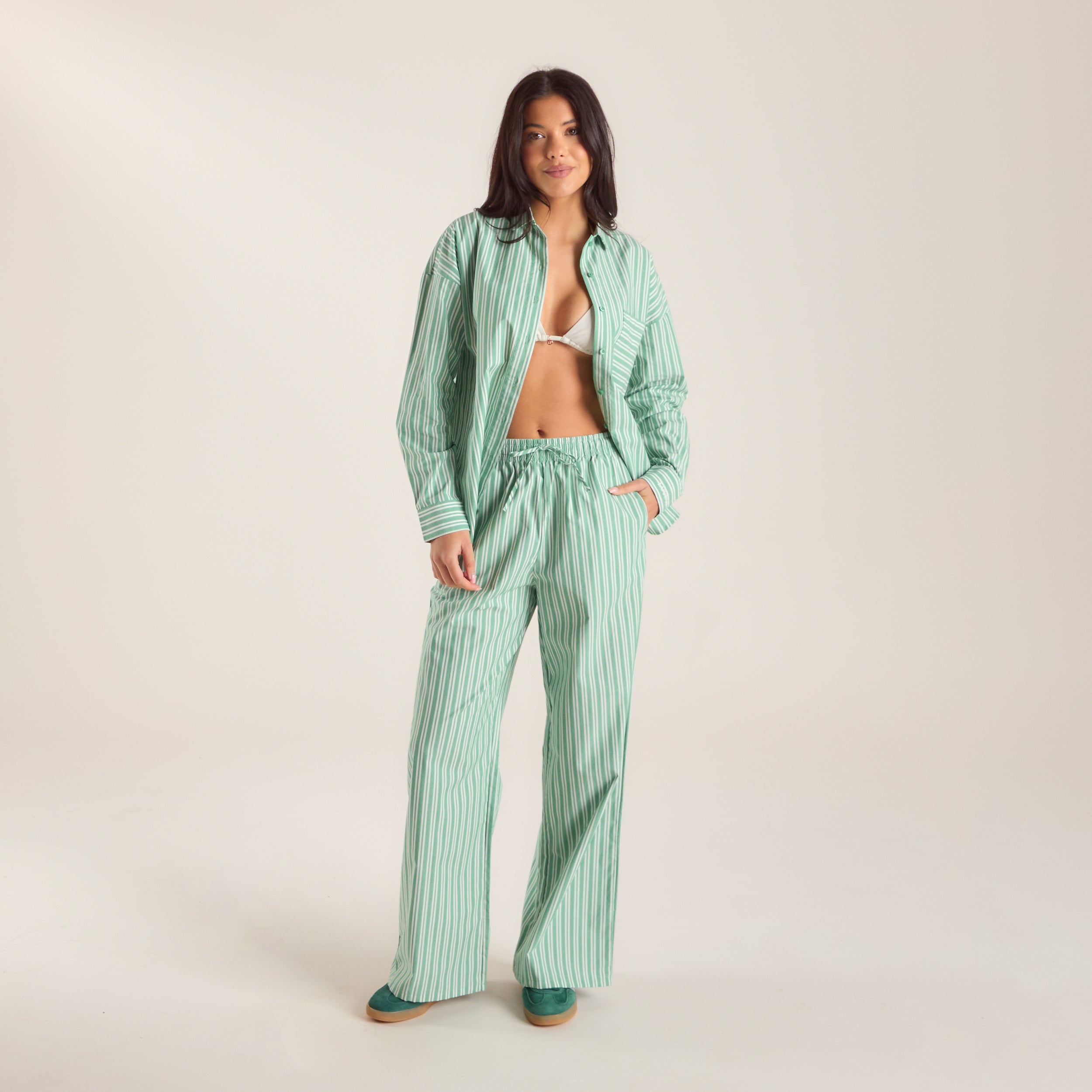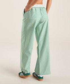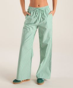 High-waisted, loose-fitting style Lightweight, soft fabrication Pockets Gathered waist with outer drawstring Lounge banner to inner waist, revealed when waistband is rolled down Perfect for morning espressos, evenings al fresco, and everything in between, these pinstripe trousers are everything you need this summer.