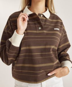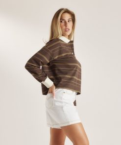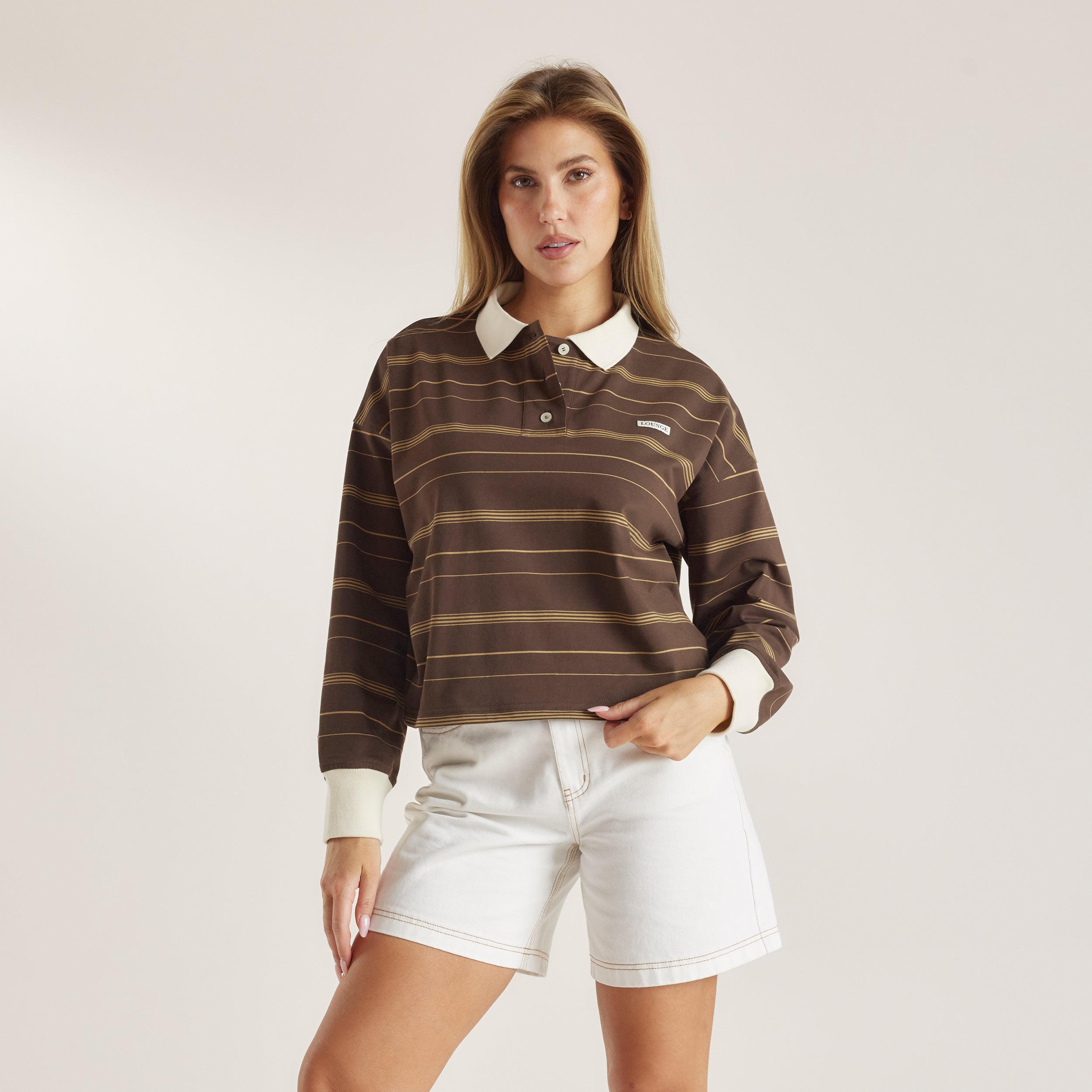 Boxy, oversized fit Button placket to front Dyed-to-match buttons with logo engraving Ribbed collar and cuff detail Yarn-dyed stripe Woven logo badge to chest |The Debut is a collection of tailored clothing designed to bring a flair of modernity to traditional shapes. Discover staple pieces that slot effortlessly into any wardrobe, with each piece crafted for quality, fit, and longevity. Lounge is now worn to be seen. The Striped Rugby Shirt is a casual, chic, wardrobe essential. The relaxed fit and considered branding make this a piece that transitions any wardrobe seamlessly from season to season.