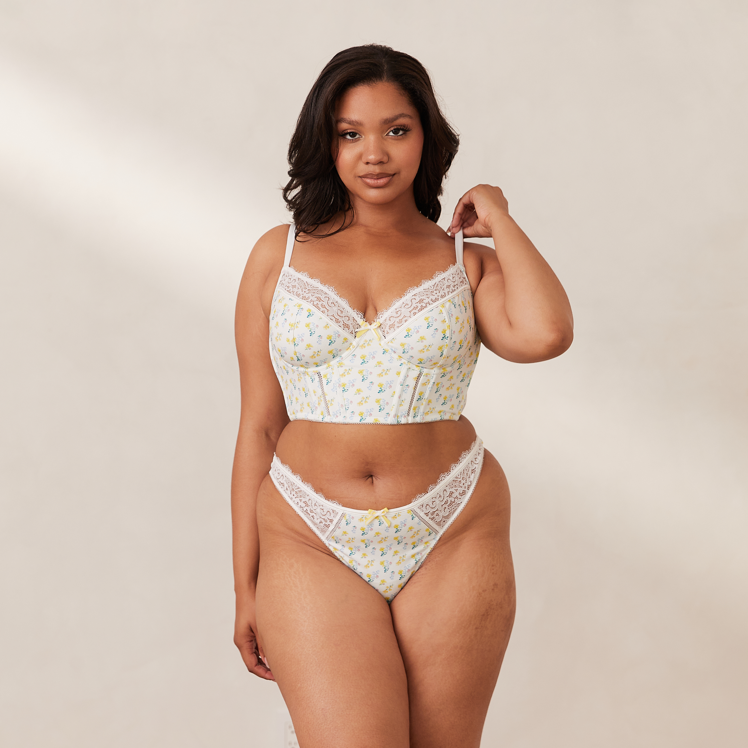 Take centre stage with the Sweet Longline Bra. Whether you wear this floral bralette as underwear or style with your favourite jeans, you’re guaranteed to steal the show. Underwired longline bra, no padding Printed floral stretch cotton fabrication paired with soft lining and eyelash lace Double satin bow details Decorative picot trim paired with criss cross elastic Boning to bodice Padded hook and eye fastening Silver Lounge engraved hardware 92% Cotton, 8% Elastane