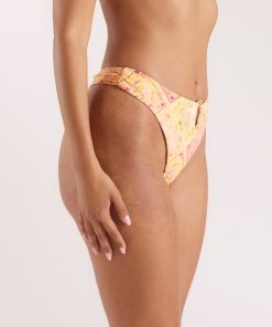 Thick, matte, sculpting fabrication Sun and moon print throughout Gathered, ruched detailing Asymmetric hammered metal rings, engraved with Lounge logo |Celestial Swim: a celebration of the sun and moon’s timeless dance across the sky. This flattering ruched bikini thong features a bohemian-inspired print and bespoke matte gold hardware. Celestial sunbursts and crescent moons adorn this piece, making it as radiant and timeless as the sunset itself.